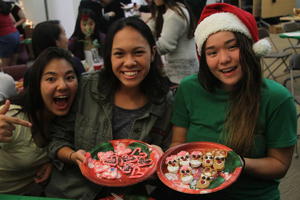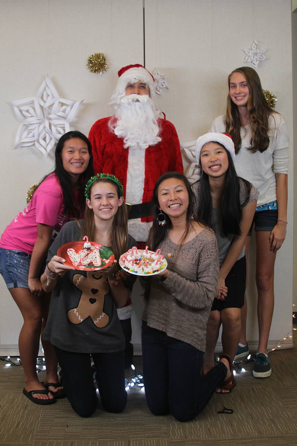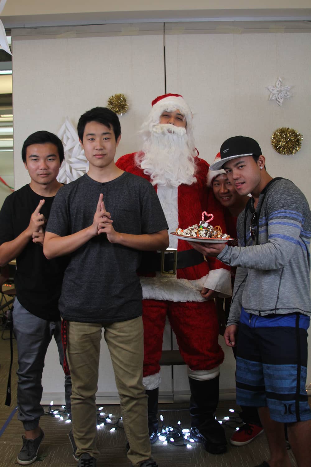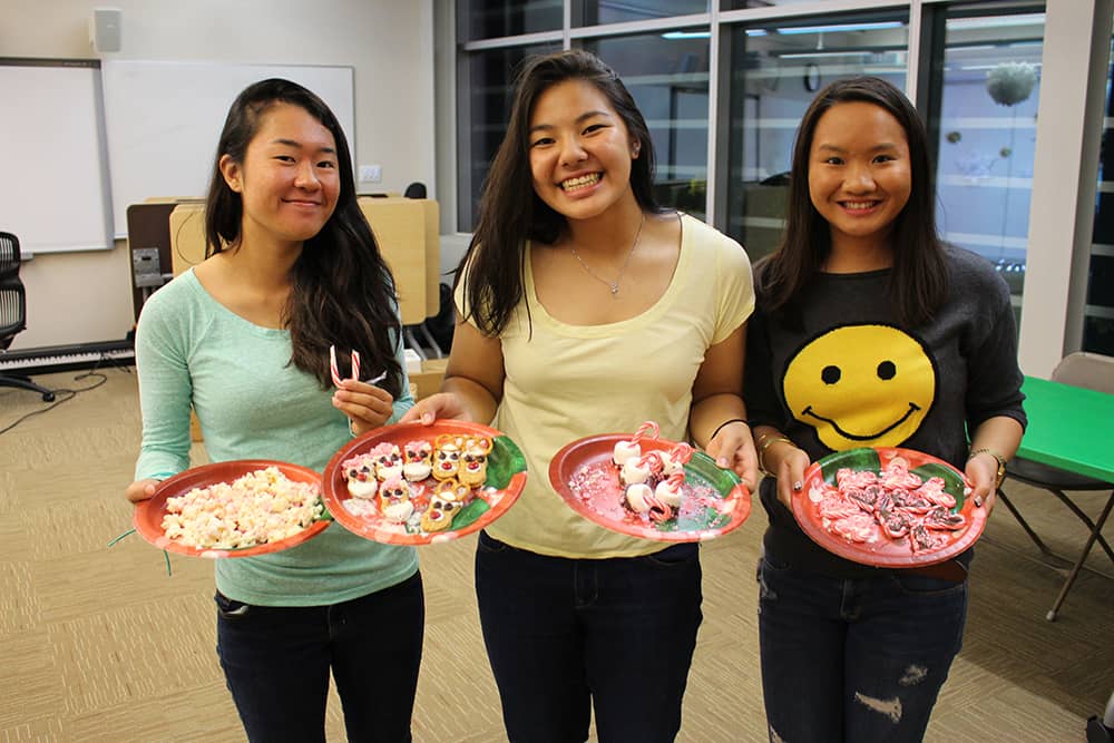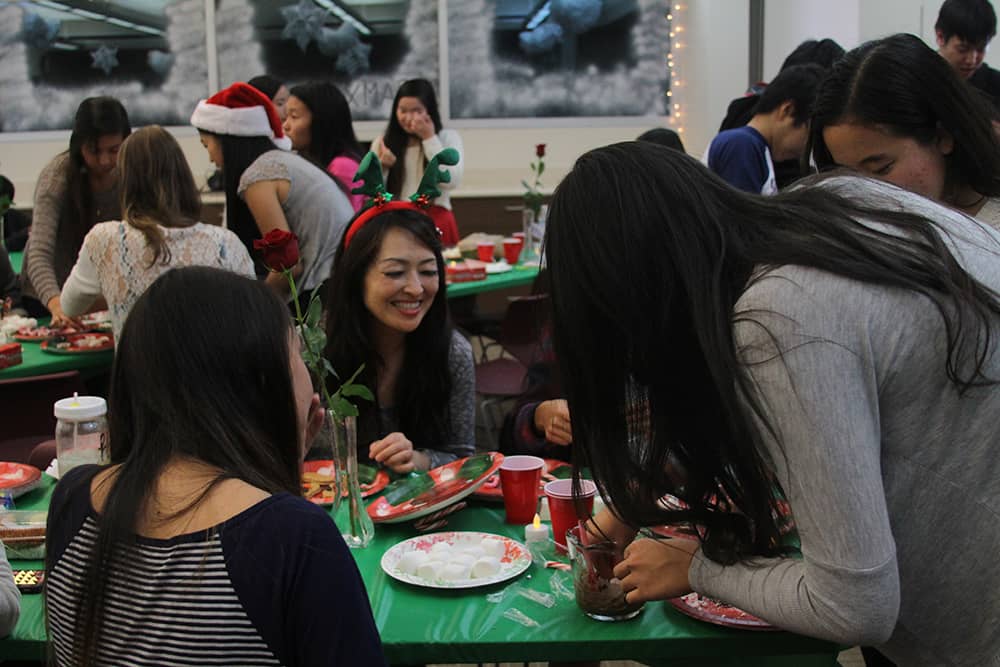Following dinner, social chair Sara Utsugi announced the next activity: a DIY Christmas treat contest. Pictures of various treats were flashed on a Smartboard as students picked from a variety of ingredients ranging from chocolate chips to candy canes to M&Ms to create their treats. The contest was judged by Physics teacher and faculty advisor Andrew Vitek, who attended the event as Santa Claus. Vitek eventually chose the winner based on taste, giving the victory to senior Jonathan Higa’s group’s creative pile of marshmallow, pretzel, and chocolate. Higa said, “My favorite part was creating the amazing mountain of snacks that beat out all the girls’ pretty snacks.” Many also took advantage of Jarrett Toyama’s photo booth and took pictures with their friends and Santa.