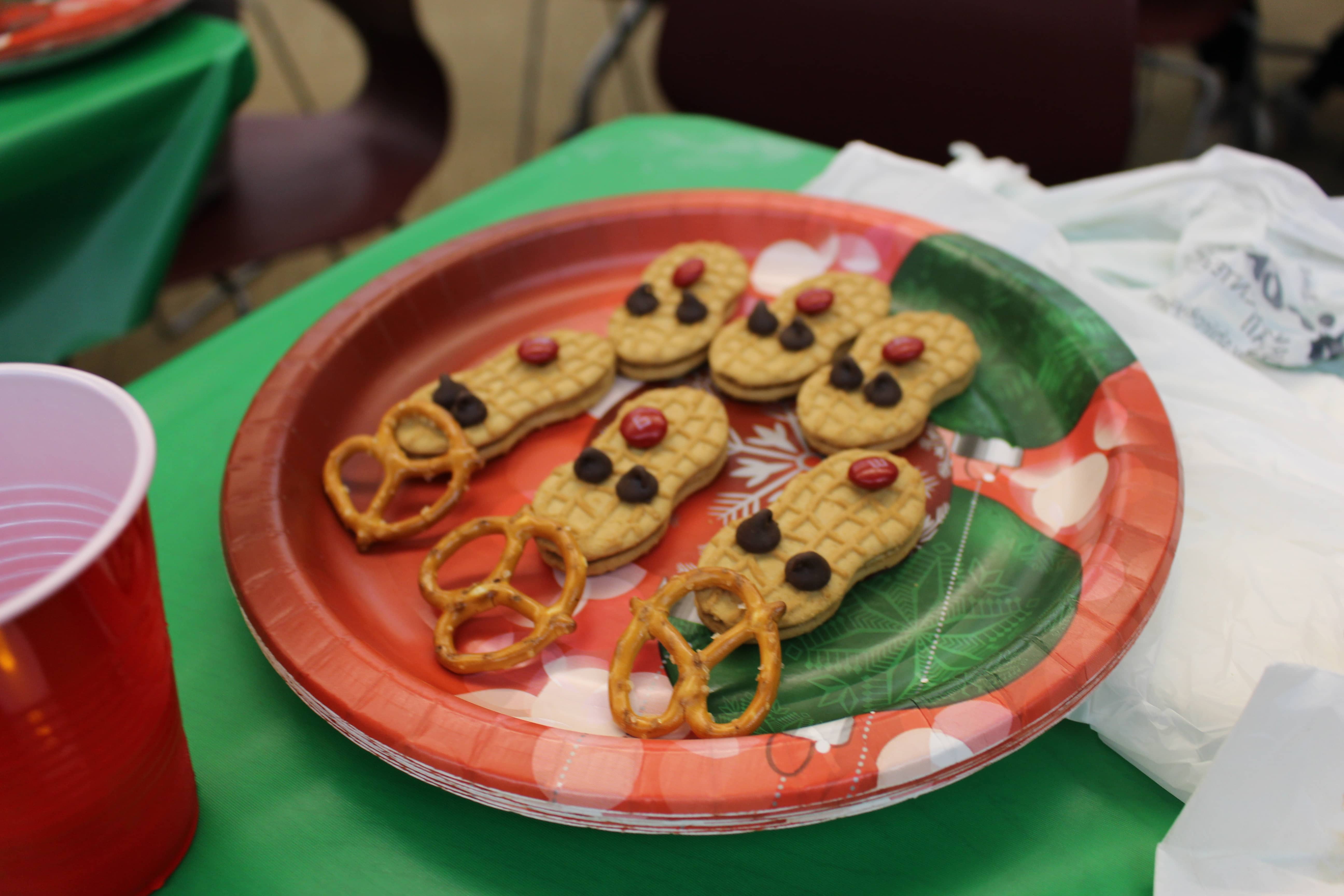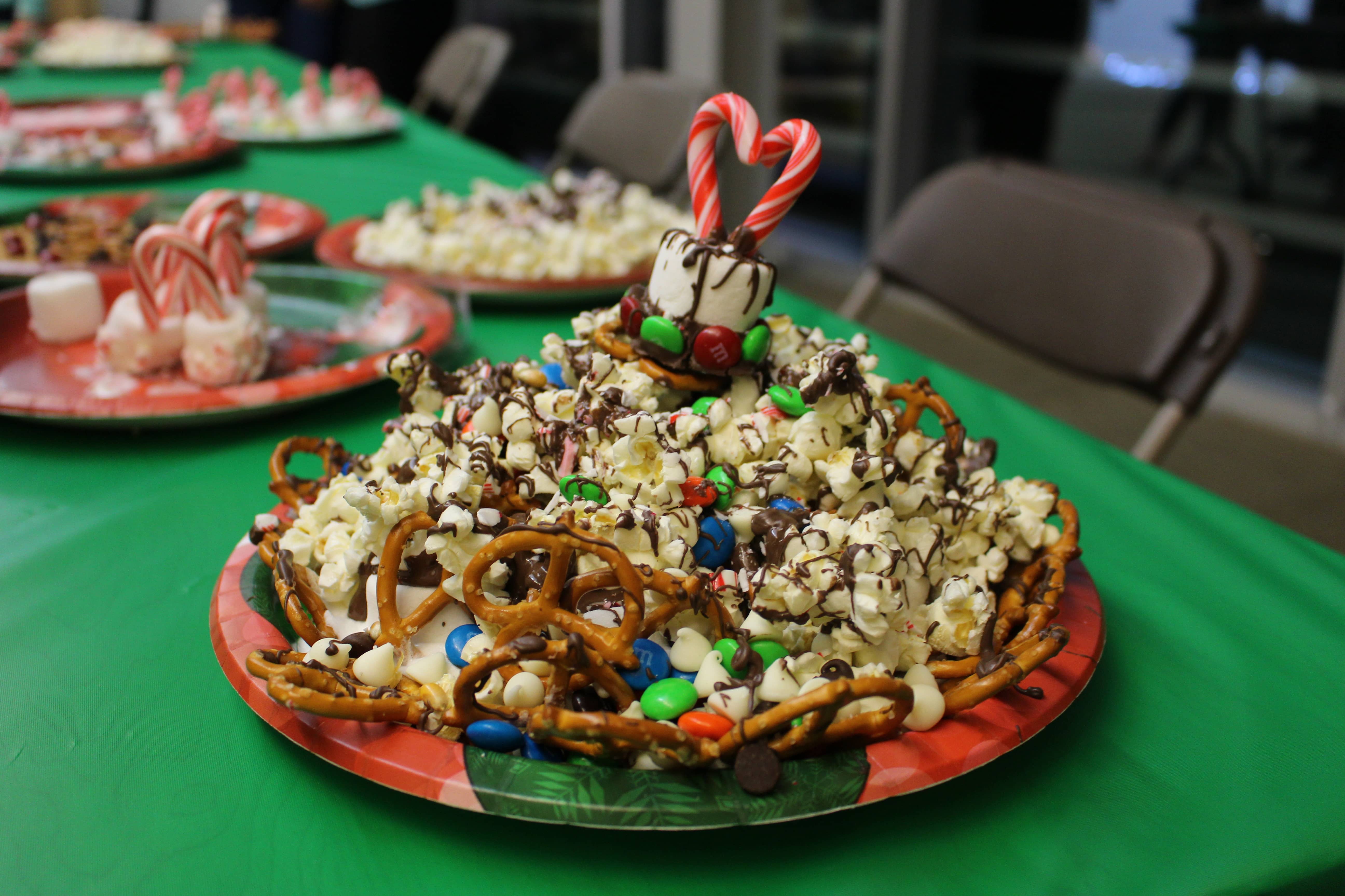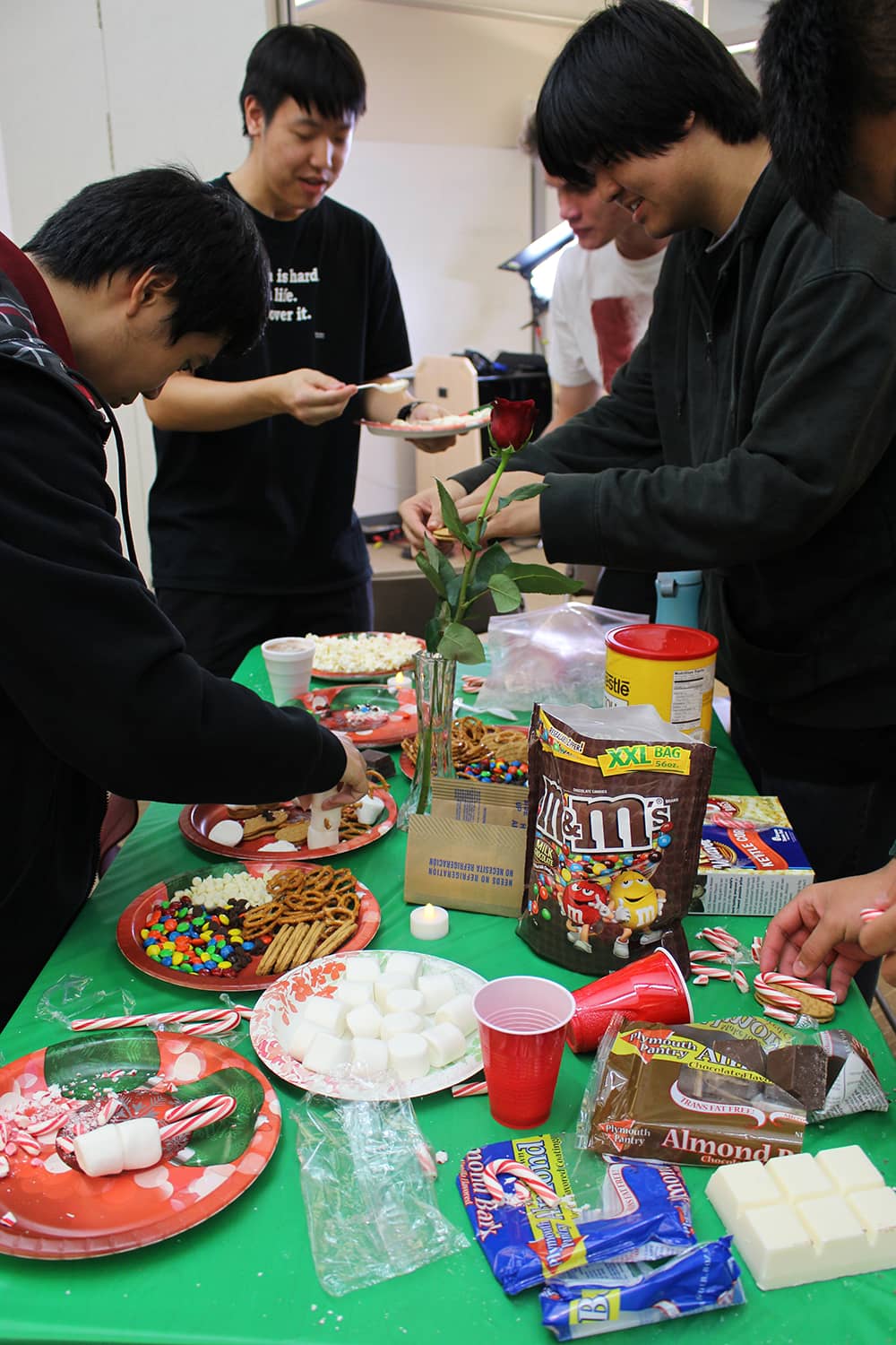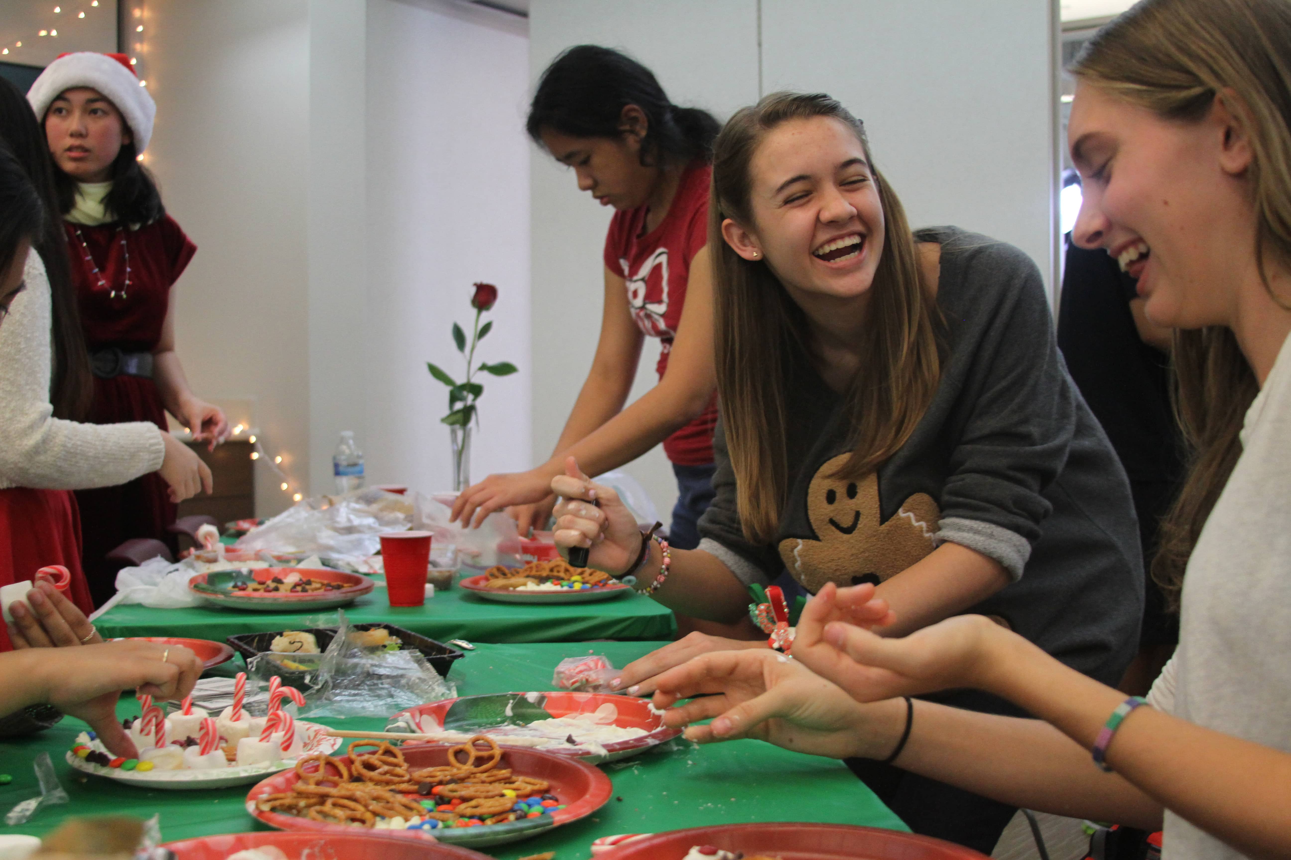 Following dinner, social chair Sara Utsugi announced the next activity: a DIY Christmas treat contest. Pictures of various treats were flashed on a Smartboard as students picked from a variety of ingredients ranging from chocolate chips to candy canes to M&Ms to create their treats. The contest was judged by Physics teacher and faculty advisor Andrew Vitek, who attended the event as Santa Claus. Vitek eventually chose the winner based on taste, giving the victory to senior Jonathan Higa’s group’s creative pile of marshmallow, pretzel, and chocolate. Higa said, “My favorite part was creating the amazing mountain of snacks that beat out all the girls’ pretty snacks.” Many also took advantage of Jarrett Toyama’s photo booth and took pictures with their friends and Santa.