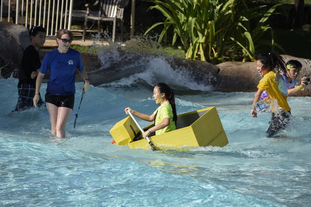 The boat building process stretched over a month and led up to a roughly 16-minute race. During the heats, boats endured the calm water in the Hawaiian Waters Wave Pool with varying degrees of success. Some boats took on water and sank, while others lasted the length of the heat. The top three boats from each heat went on to compete in the final race.